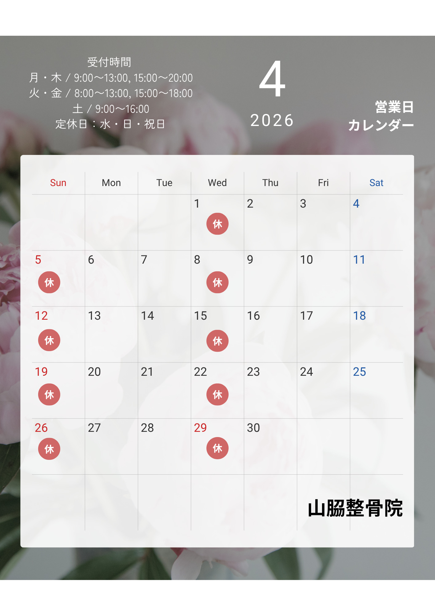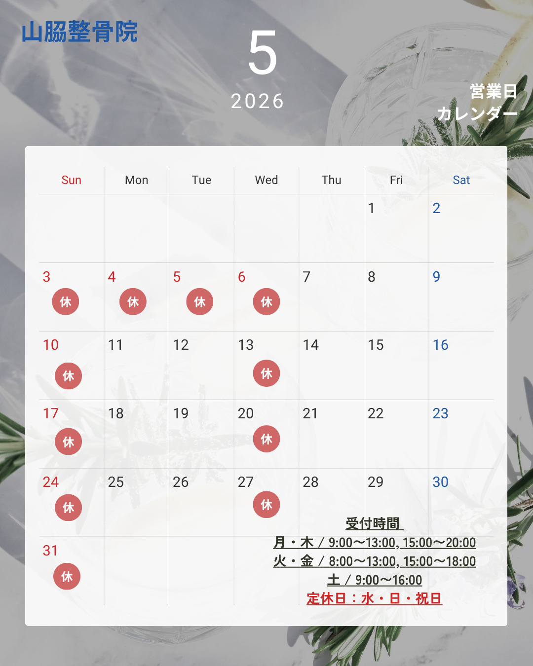 ※出勤時間や帰宅時間の関係で、営業時間にどうしても間に合わない方は、月.木曜日は夜9時頃まで、火.金.土曜日は朝8時頃から(前日までに要予約)施術可能です。お気軽にご相談ください。