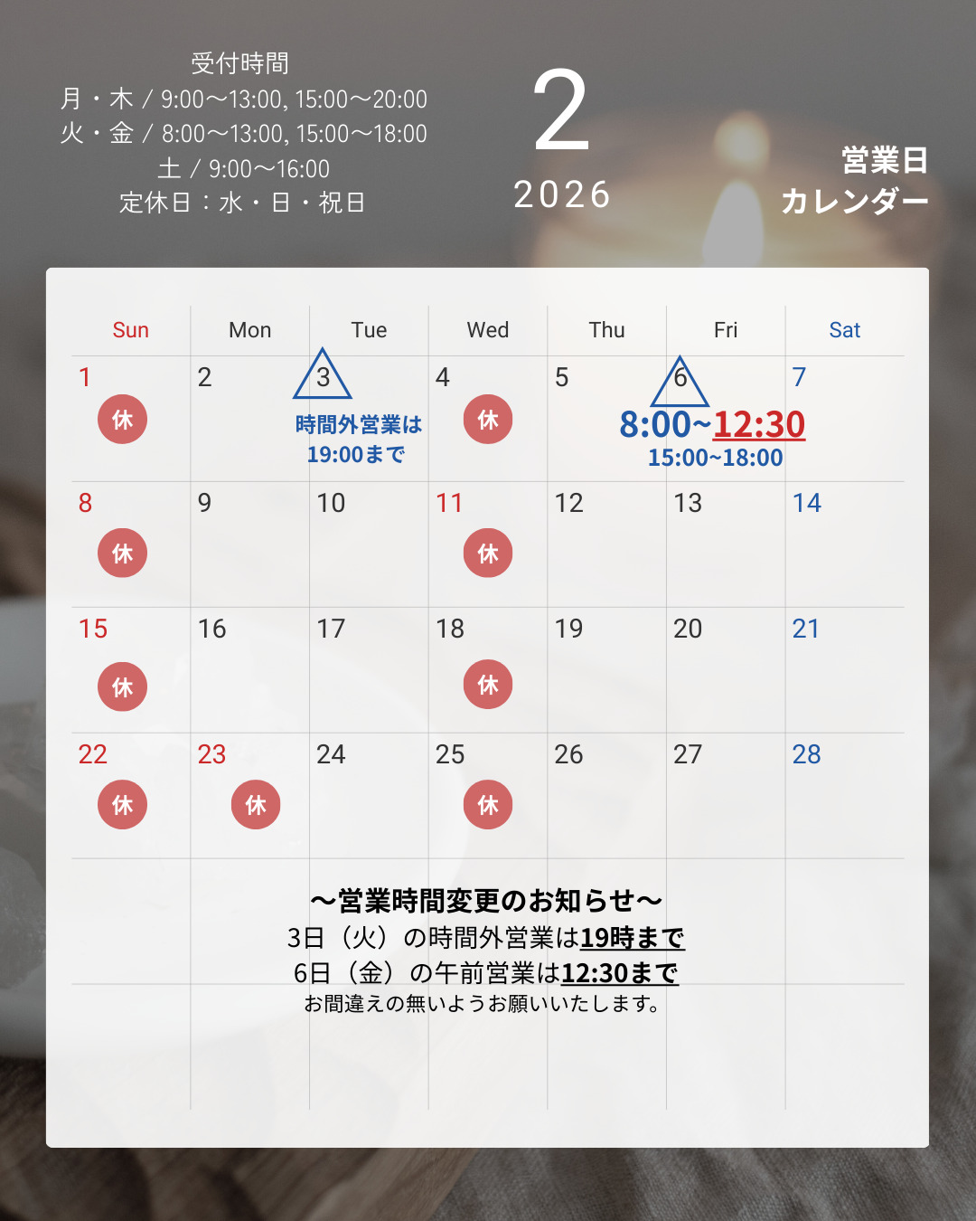 ※出勤時間や帰宅時間の関係で、営業時間にどうしても間に合わない方は、月.木曜日は夜9時頃まで、火.金.土曜日は朝7時頃から(前日までに要予約)施術可能です。お気軽にご相談ください。